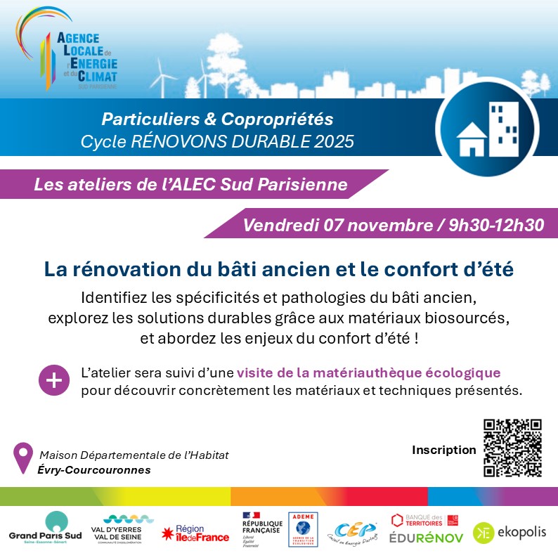 L’Agence Locale de l’Énergie et du Climat Sud Parisienne vous propose de participer à un atelier dédié à la rénovation du bâti ancien et au confort d’été vendredi 07 novembre à partir de 09h30.